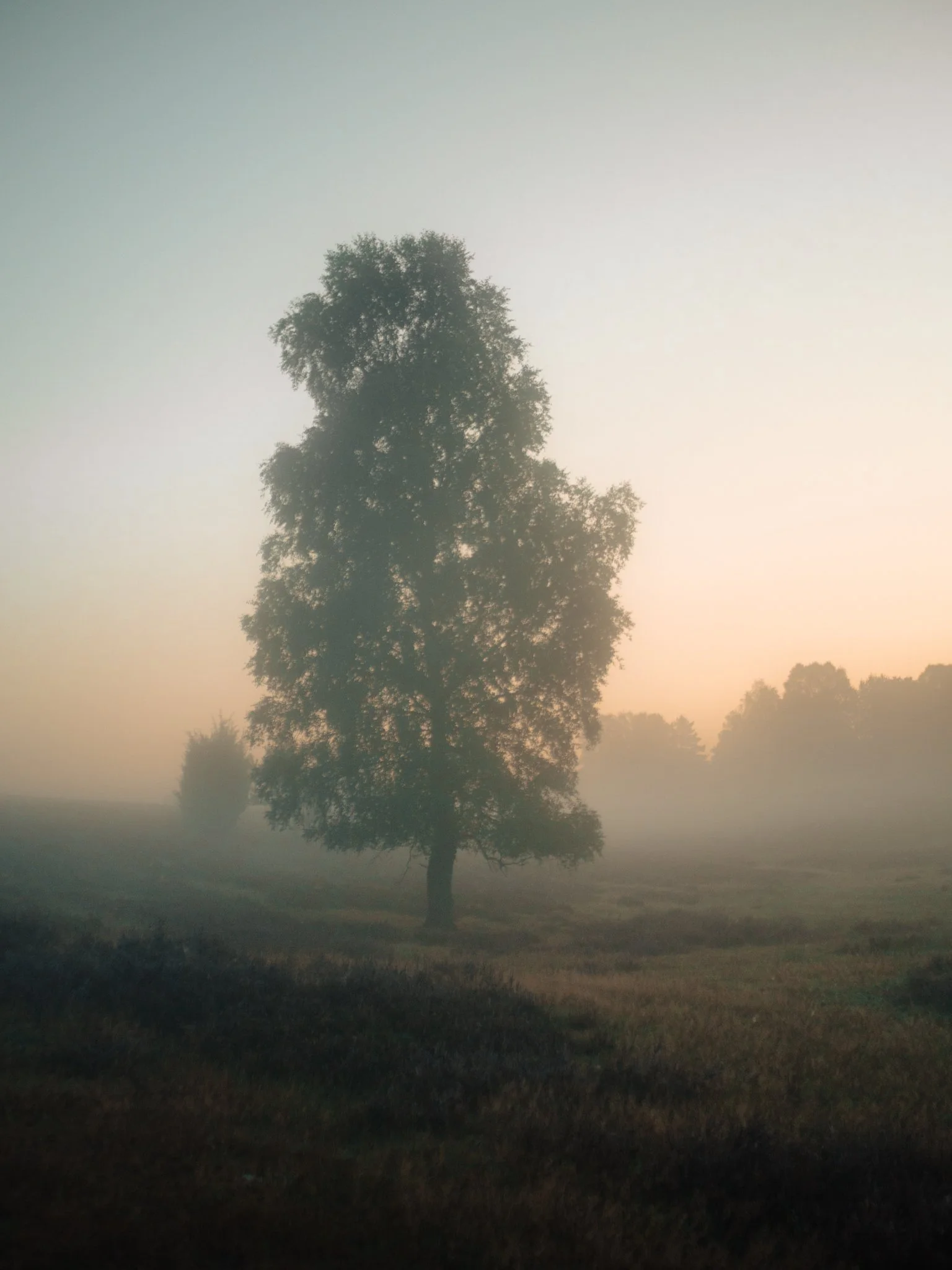 In the early morning, as the sun starts to rise, the fog starts to transform into a golden cloud that fills the Heide and its blossoming flowers.